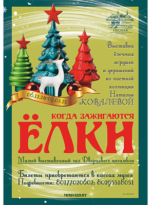 В Малом выставочном зале Дворцового ансамбля с 6 декабря 2024 г. по 9 февраля 2025 г. действует выставка ёлочных игрушек и украшений из частной коллекции Натальи Ковалевой «Когда зажигаются ёлки».