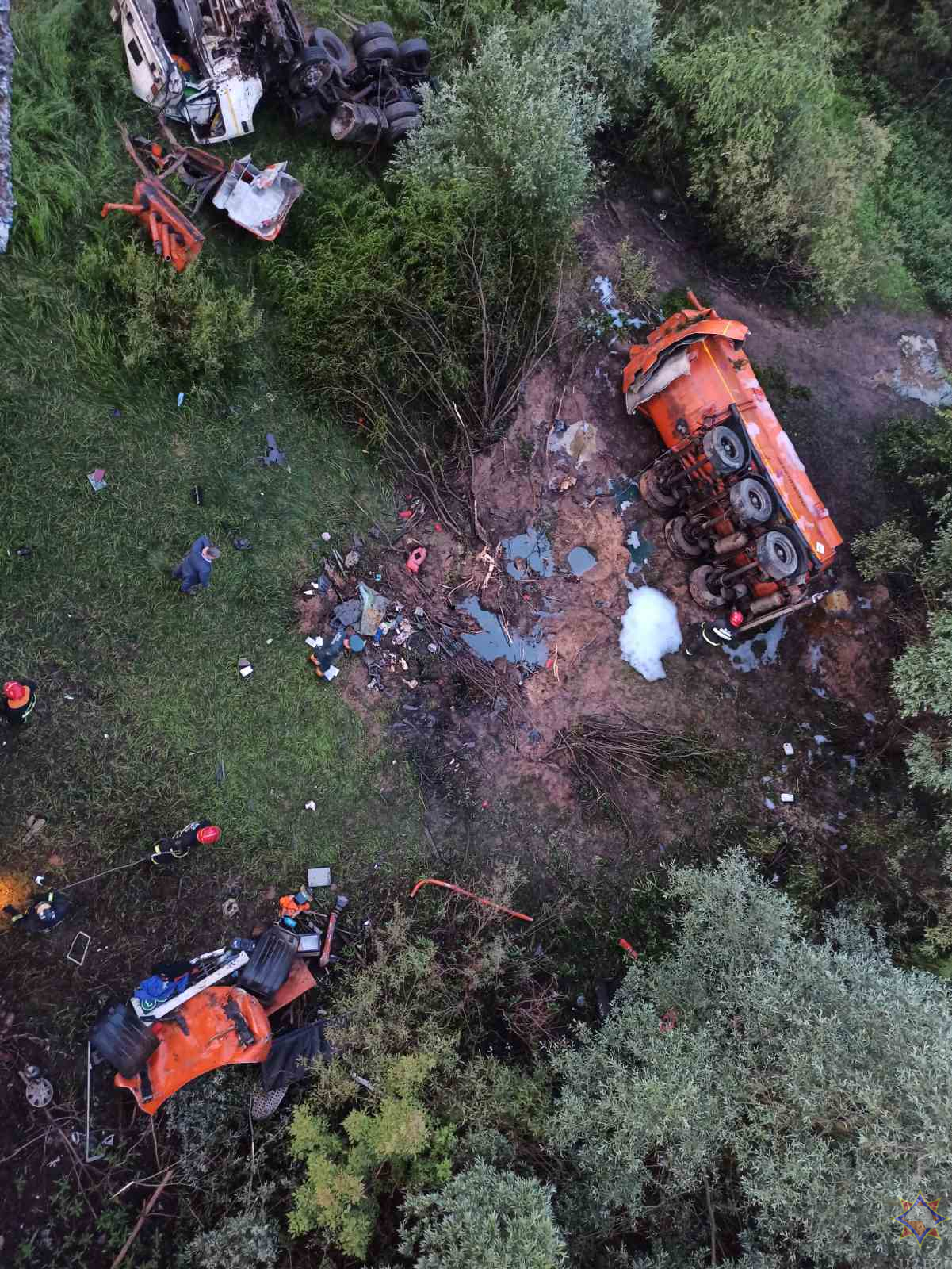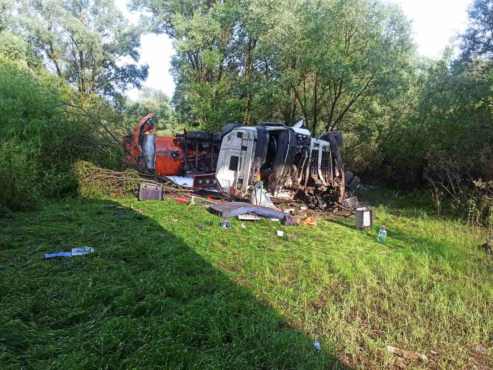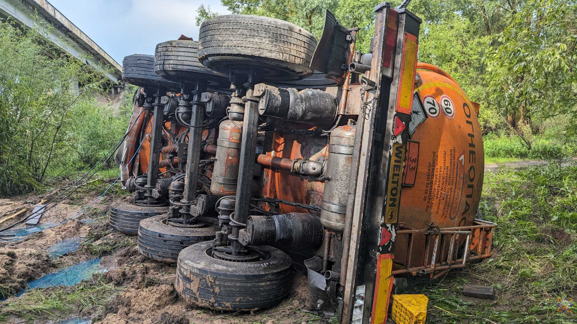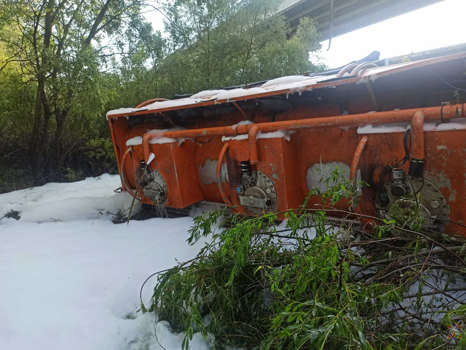 Вчера вечером спасателям поступило сообщение о ДТП на трассе М-10 в Речицком районе. Грузовой автомобиль с полуприцепом-цистерной пробил дорожное ограждение и упал с моста через реку Днепр. Цистерна из 4 секций была заправлена топливом объёмом почти 25 тонн.