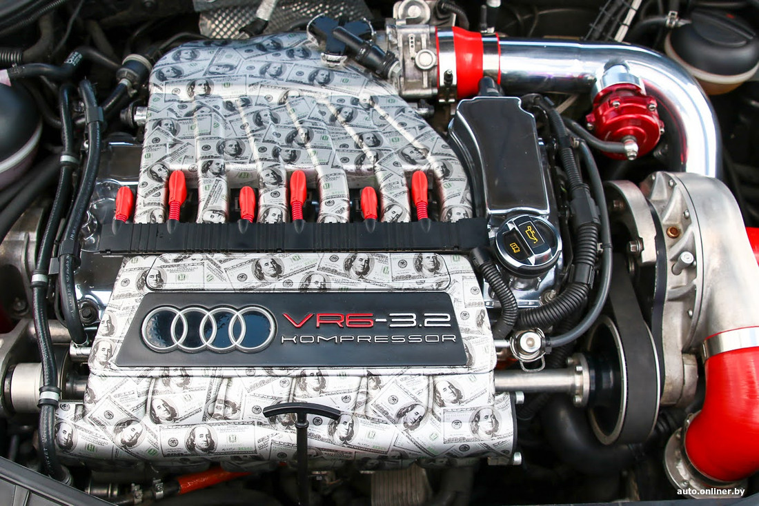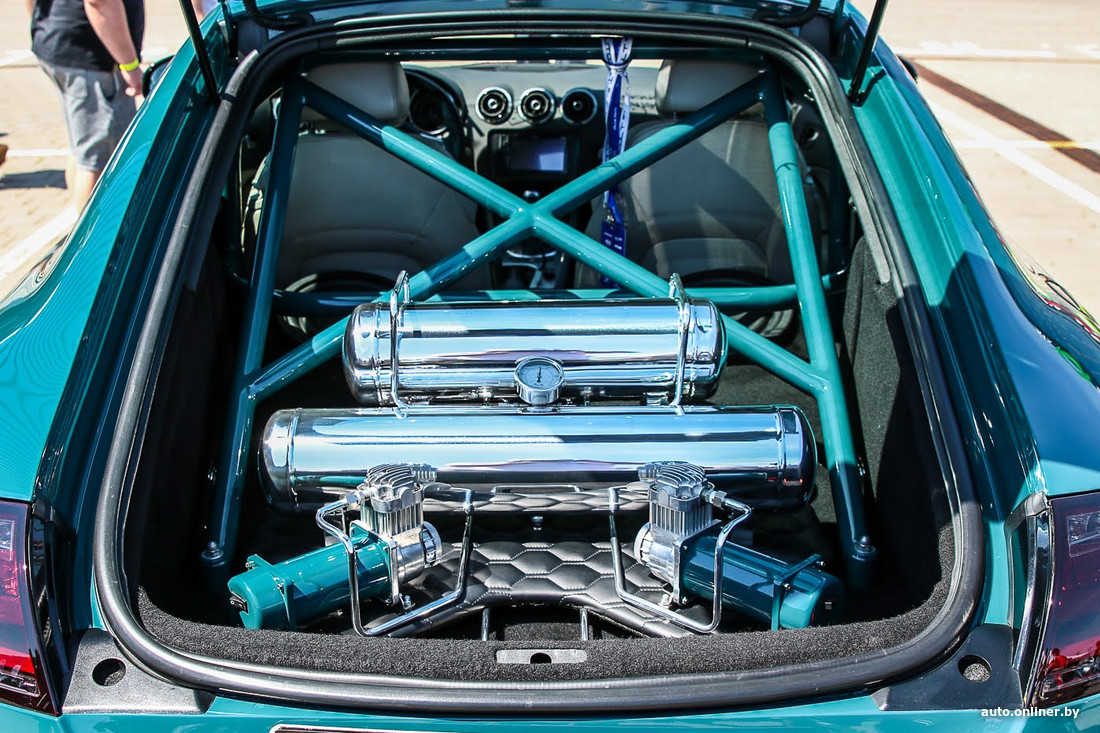 — Купил ее 6-7 лет назад, и сразу начал потихонечку тюнинговать. Машина доработана вся: начиная от мотора (на стенде машина показала мощность в 375 л.с.), заканчивая подвеской, мультимедиа и т.д. Не заменены разве что центральная консоль и сидения. Стоит пневмоподвеска, заменены все обвесы, спойлер кастомный, компрессор ABT… — владелец авто Александр перечисляет лишь малую часть всех изменений в машине.