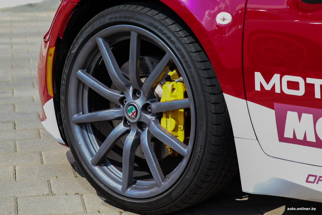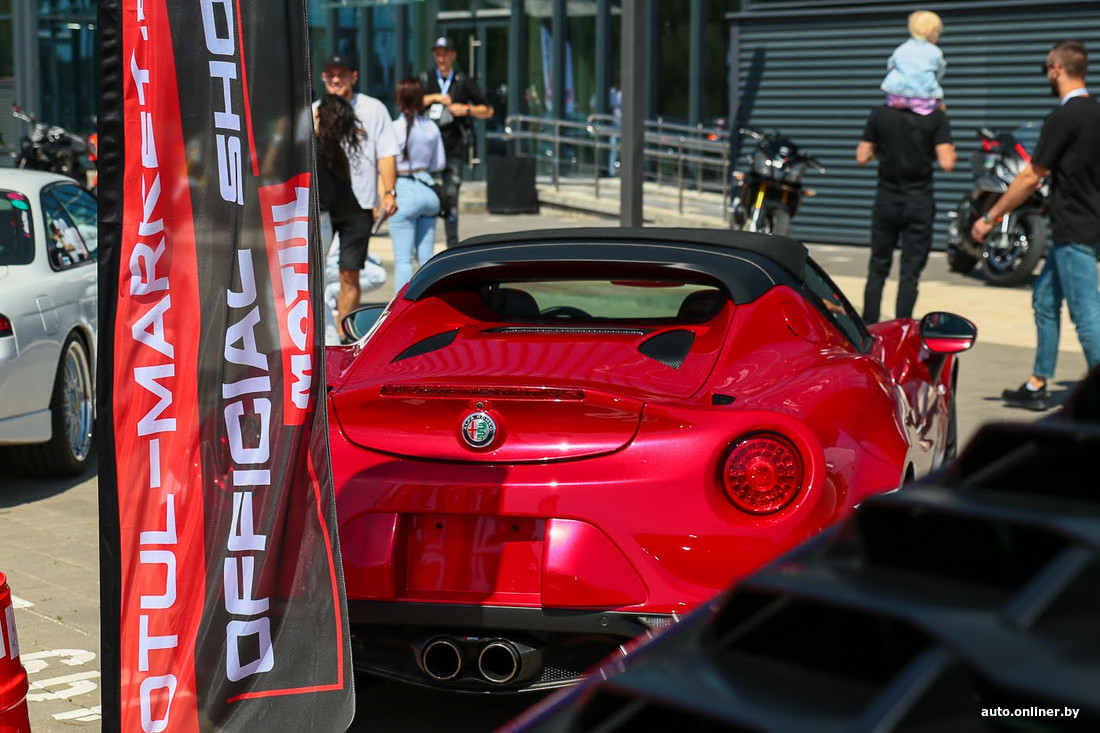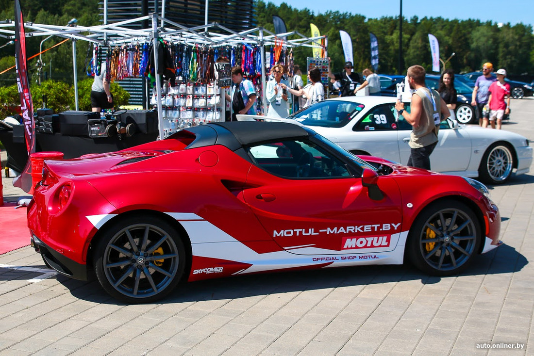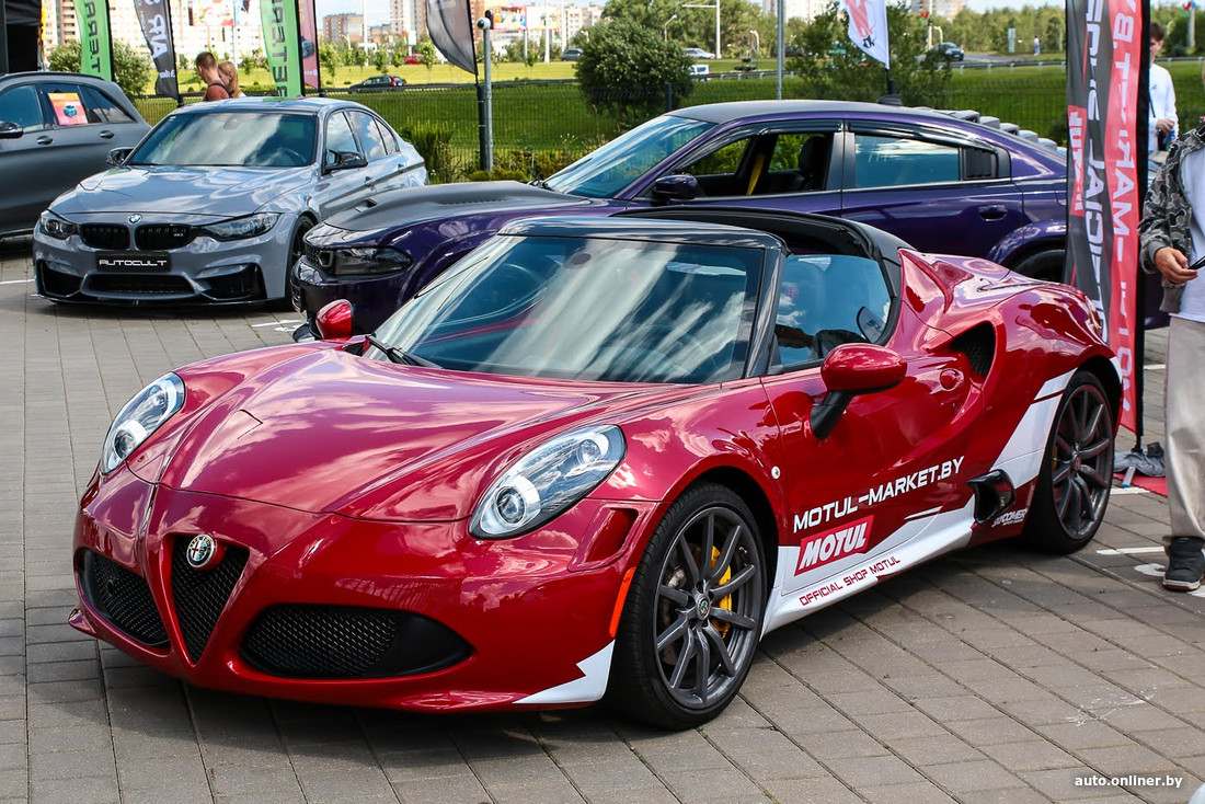 Этот «итальянец» приехал в Беларусь из Америки с пробегом 13 000 км. Именно на AutoCult состоялась его премьера. Мотор имеет объем 1,75 л, а мощность — 240 л.с. При этом вес максимально облегчен (в том числе благодаря обилию карбона) — всего 800 кг. Благодаря этому, по заводским данным, автомобиль разгоняется до «сотни» за 4,5 секунды. Выхлопная система в этом экземпляре от известной словенской мануфактуры Akrapovič.