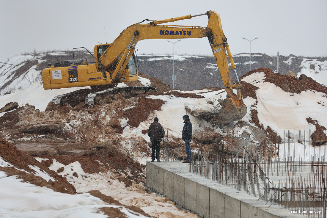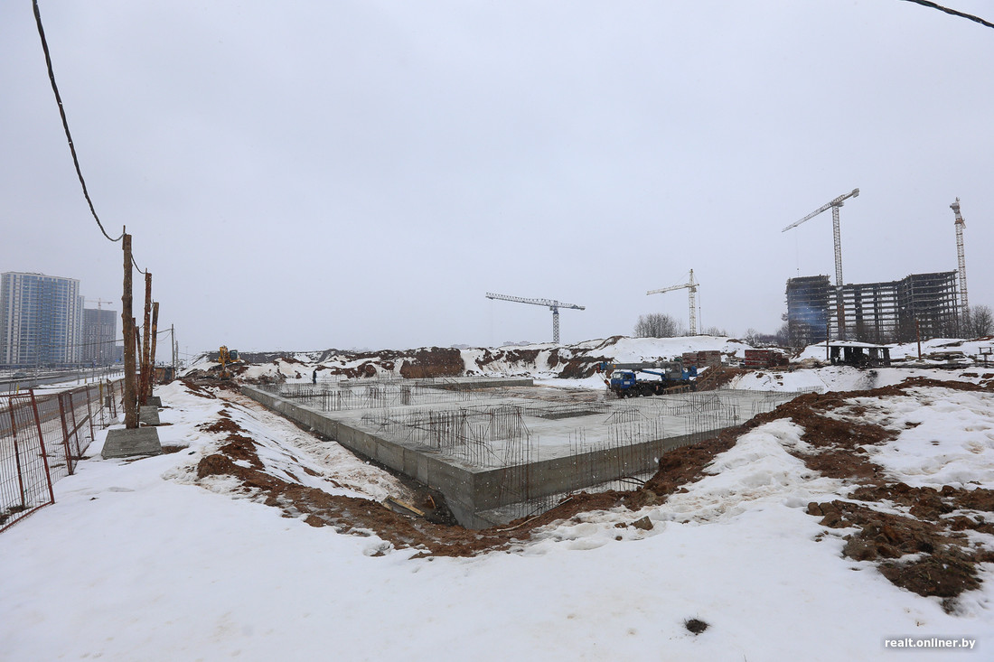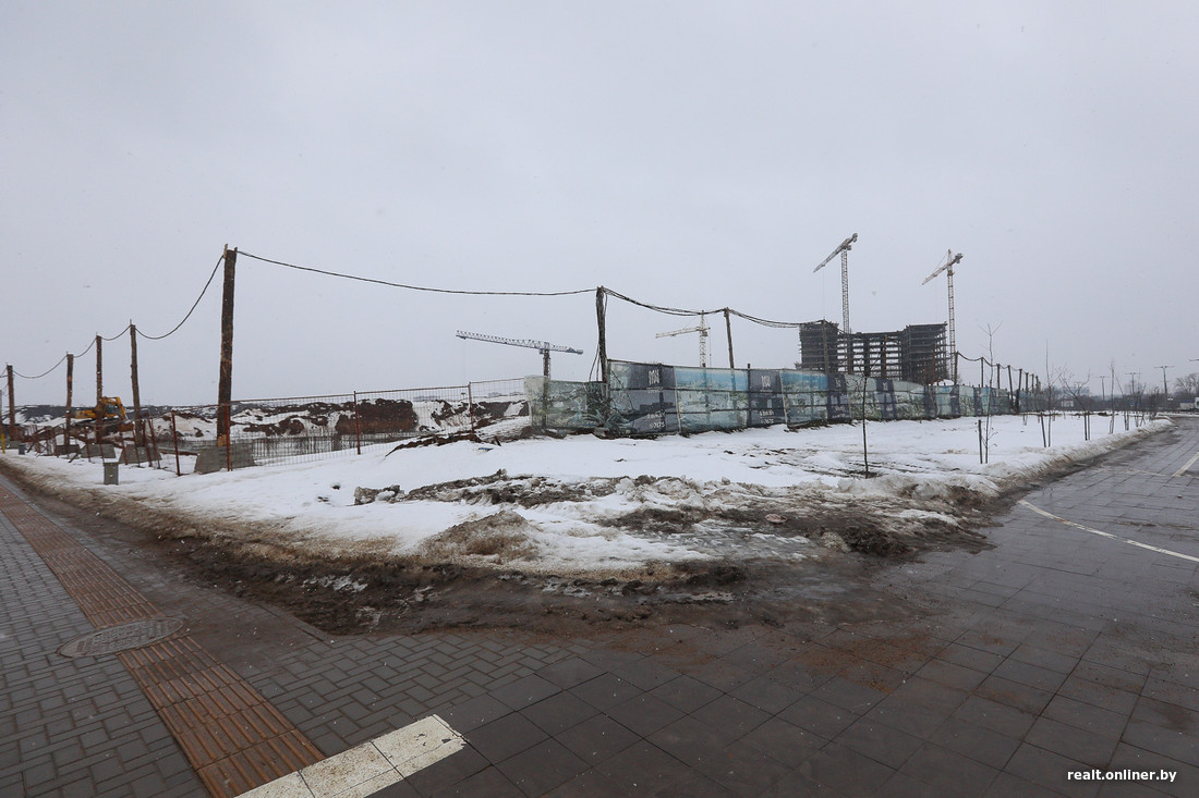 Прямо напротив «Несвижского замка», через будущий зеленый бульвар, строится «Мирский». По сути, это зеркальный брат-близнец: этажность и наполнение те же (только без ФОКа). Пока здание только в самом начале своего пути, даже П-образный контур проявился только на уровне фундамента.