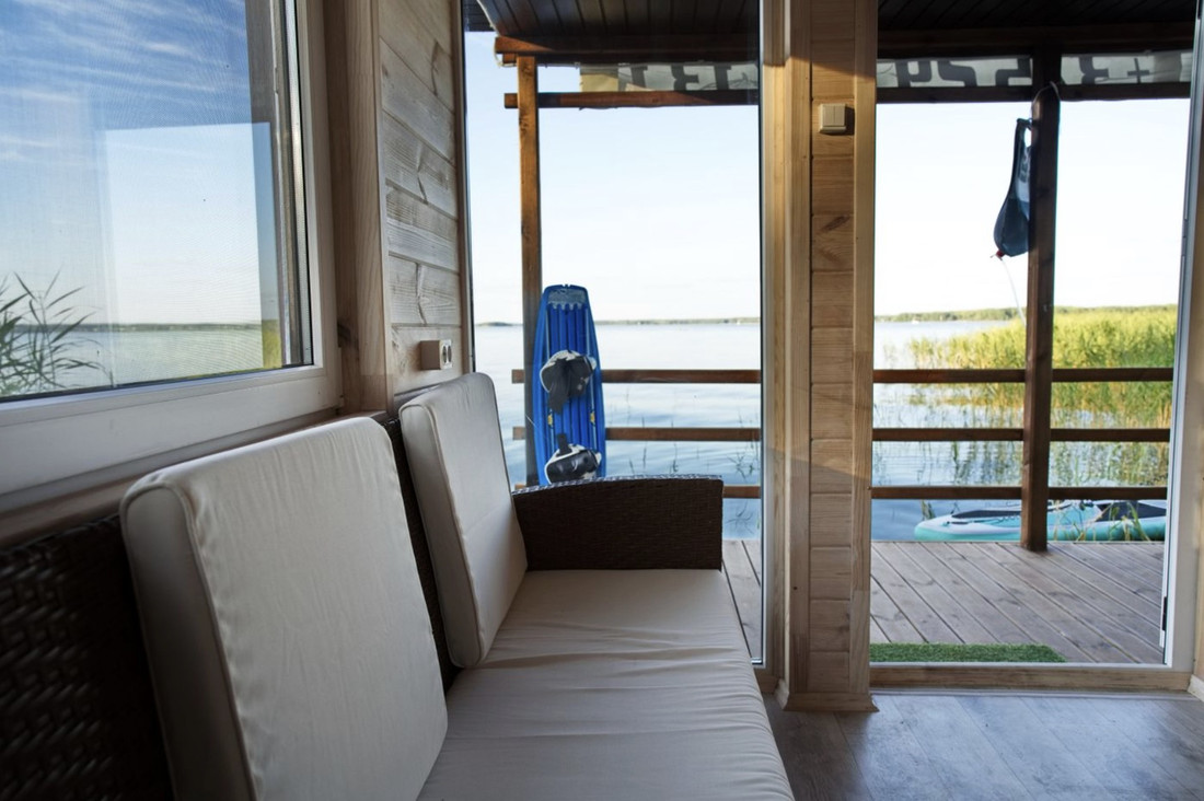 Дом-баня разбит на несколько «секторов»: есть 20-метровая жилая комната с кухней и диваном, парилка, небольшая терраса, установлен биотуалет. Высота потолков в помещениях — 2,7 метра. Само собой, есть Wi-Fi (куда без него сейчас).