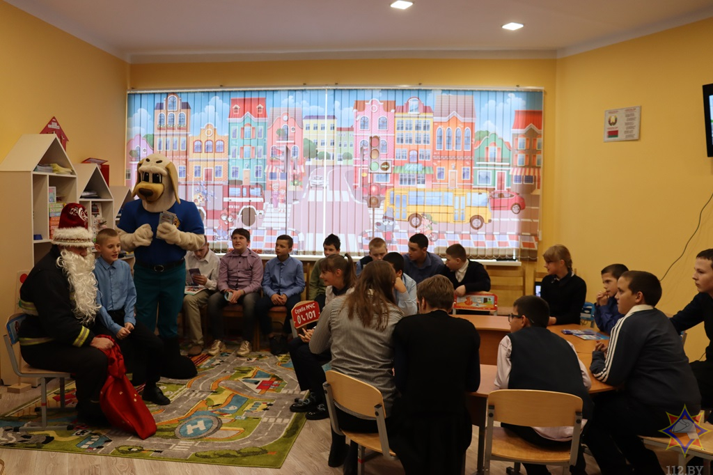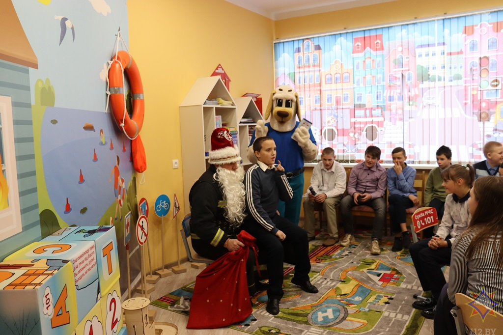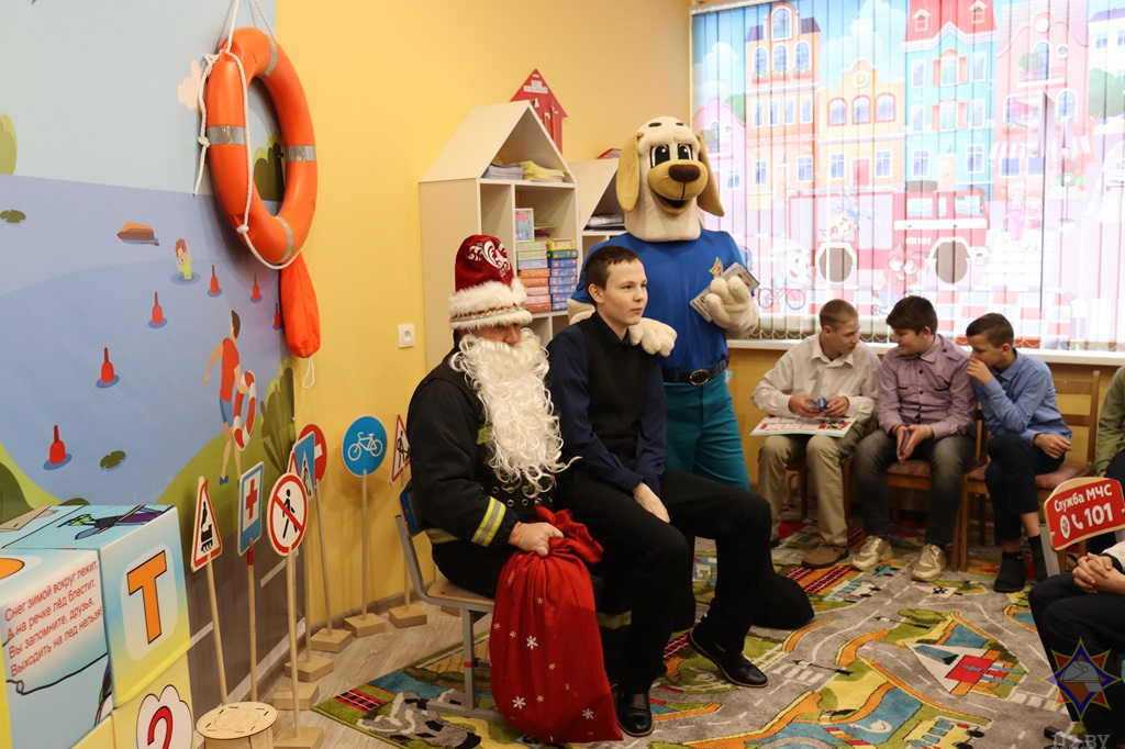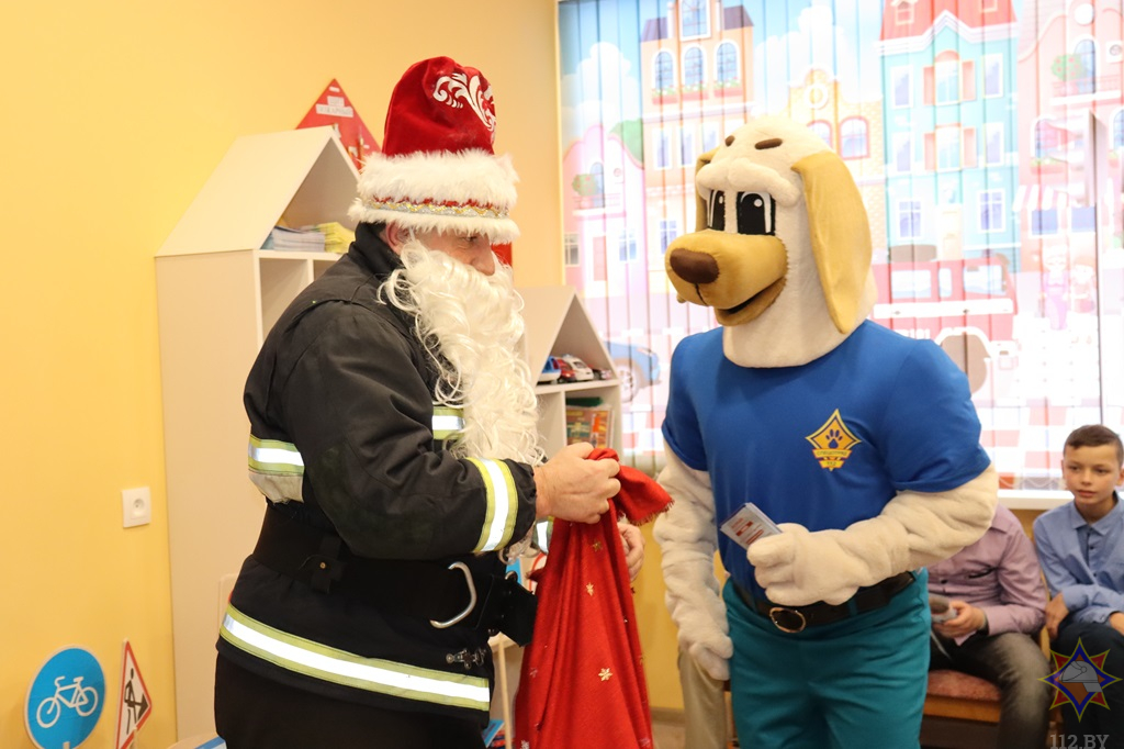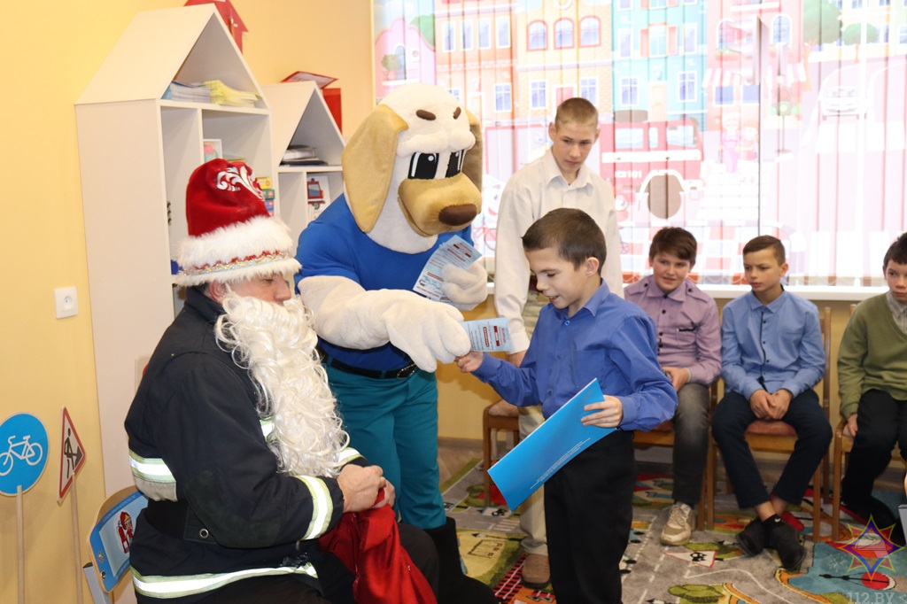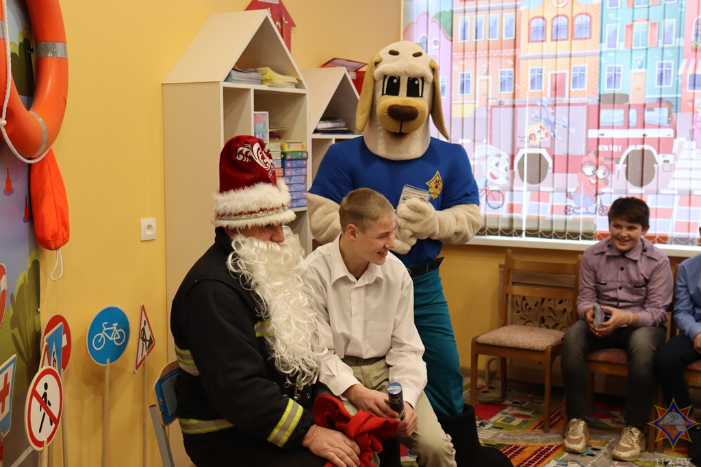 С увлекательной и познавательной программой в гости к воспитанникам ГУО «Городейская вспомогательная школа-интернат» приехал пожарный Дед Мороз со своим помощником «Профи». Но появился он не сразу. В начале мероприятия инспектор сектора пропаганды и взаимодействия с общественностью Несвижского райотдела по ЧС Яна Бурнель провела интерактивную игру с ребятами на знание правил безопасности, поиграли в театр-экспромт, а также просмотрели новый мультсериал «Спецотряд 112». После чего, как и на всех новогодних праздниках появился пожарный Дед Мороз со своим помощником «Профи». Они поздравили ребят с наступающим Новым годом, и еще раз напомнили о важности соблюдении требований безопасности во время зимних каникул и праздновании Нового года. Ну и конечно, что за праздник без подарков? Наш пожарный Дед Мороз со своим помощником не могли прийти с пустыми руками, а для того, чтобы получить подарок, воспитанникам школы-интернат необходимо было рассказать стихотворение либо ответить на вопросы новогодней викторины от пожарного Деда Мороза.